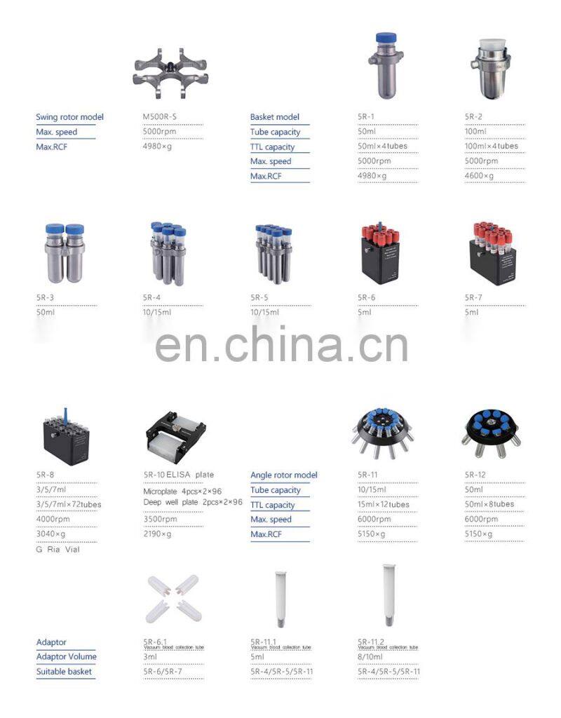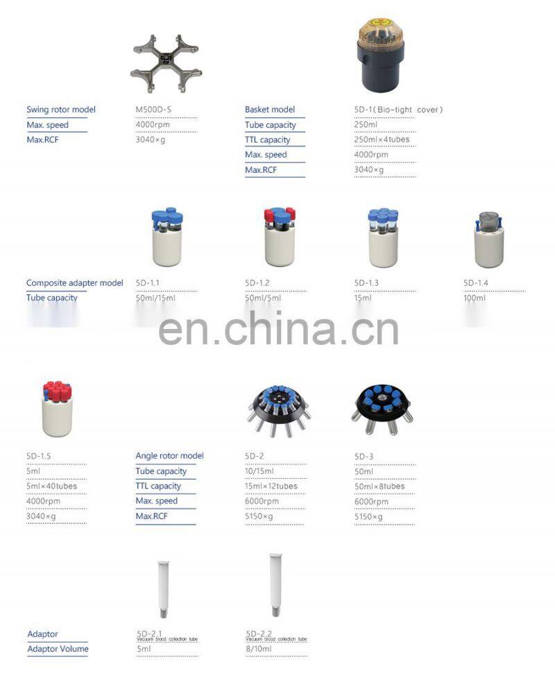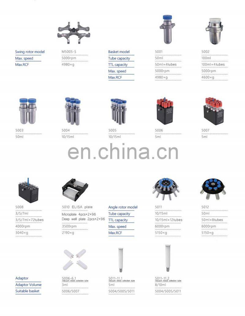 The Air-Cooled Lower Speed Centrifuge LM500D with wide option of swing rotors and adapters for 5ml blood collection tube.50/15ml,50/5ml, 15ml,100ml 250ml centrifuge tubes, Angle rotor for 10/15ml, 50ml. 200-6000rpm,Max.RCF 5150×g/step increase10×g,Timing control 1-99hrs or 1-59min or 1-59sec. 5 inch IPS full view 16 million chroma true color LCD display. Real-time display of speed up and down.