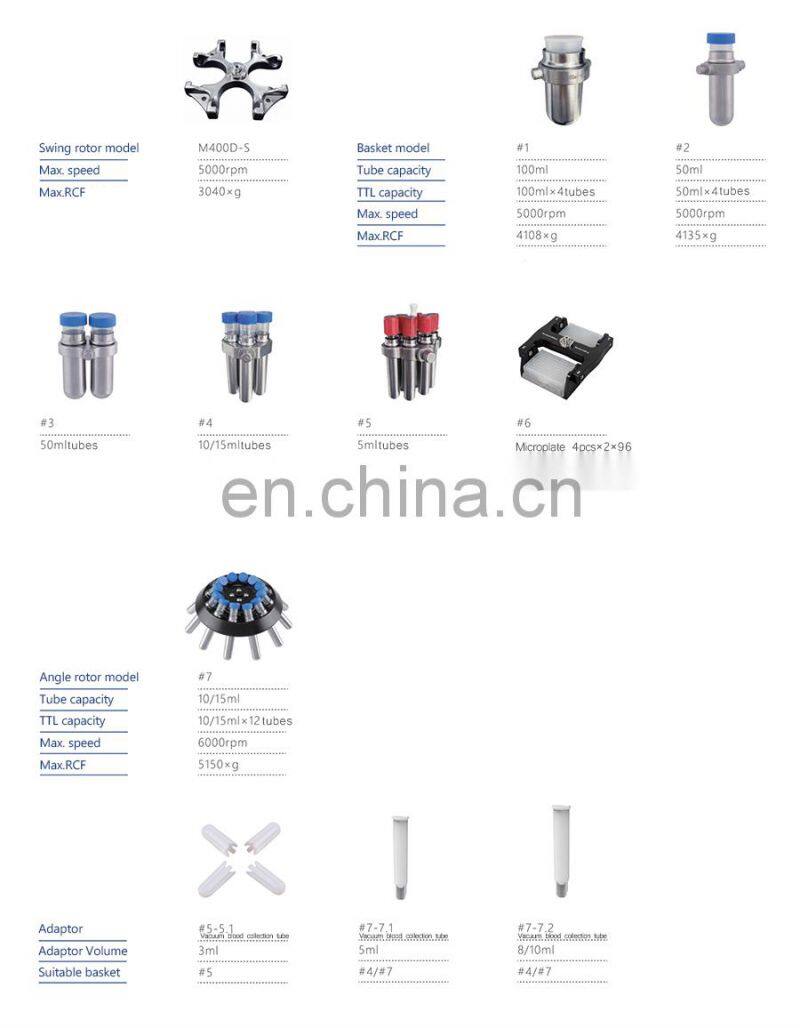The Air-Cooled Lower Speed Centrifuge M400D with wide option of swing rotors and adapters for 5ml blood collection tube.10/15ml,50ml,100ml centrifuge tubes and microplate,deep well plate. Angle rotor for 10/15ml. 100-6000rpm,Max.RCF 5150×g/stepincrease10×g,Timing control 1-99min or 1-59sec.Real-time display of speed up and down.