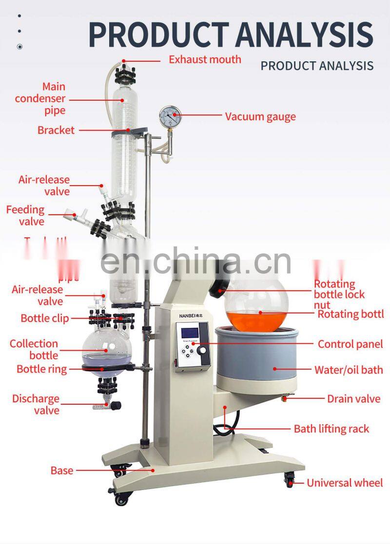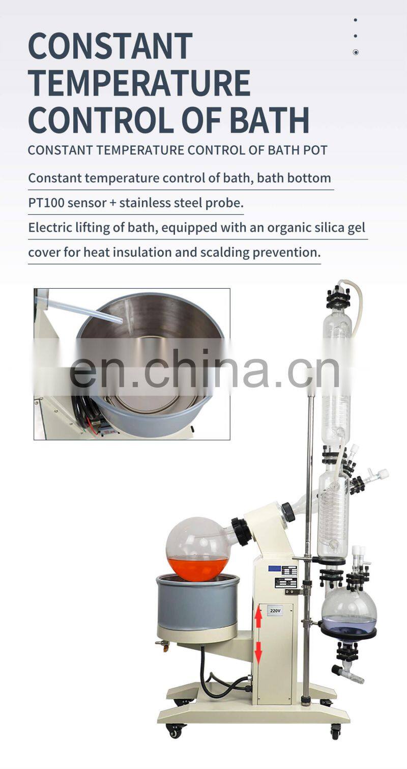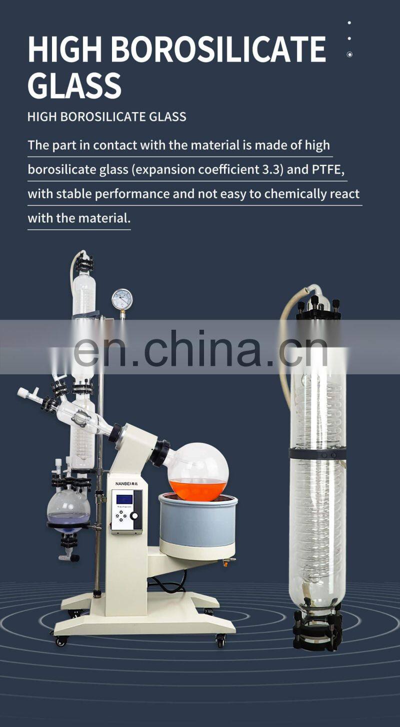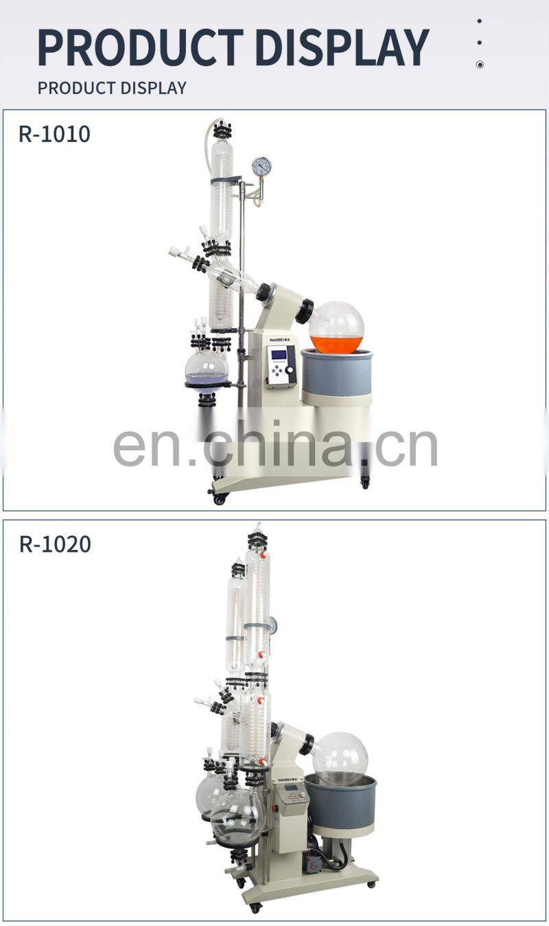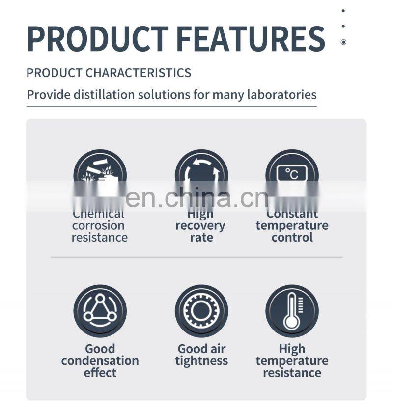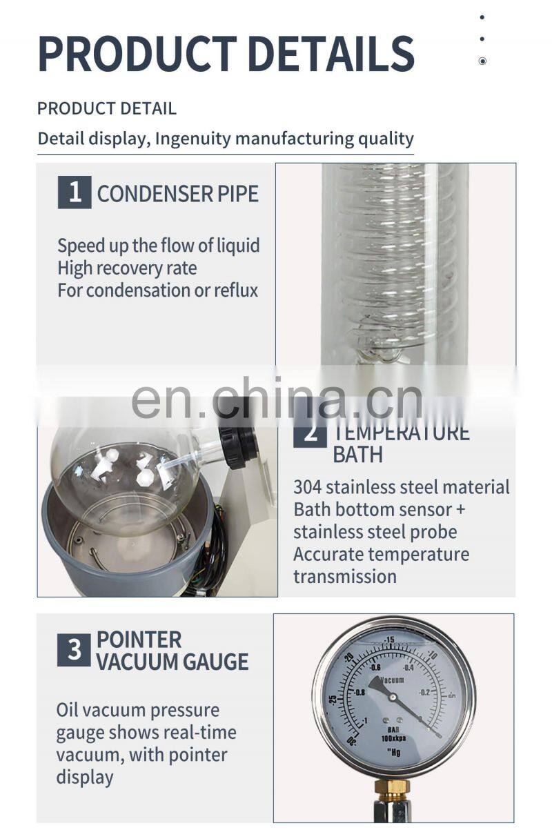 Rotary evaporator use stepless speed to make the glass rotating bottle constant rotation, the material in the bottle wall to form a large area of uniform film, and then through the intelligent constant temperature water bath heat the rotating bottle uniformly, high-speed evaporation under vacuum case, after the efficient glass condenser cooling, the solvent vapor will recycle in the collection bottle.