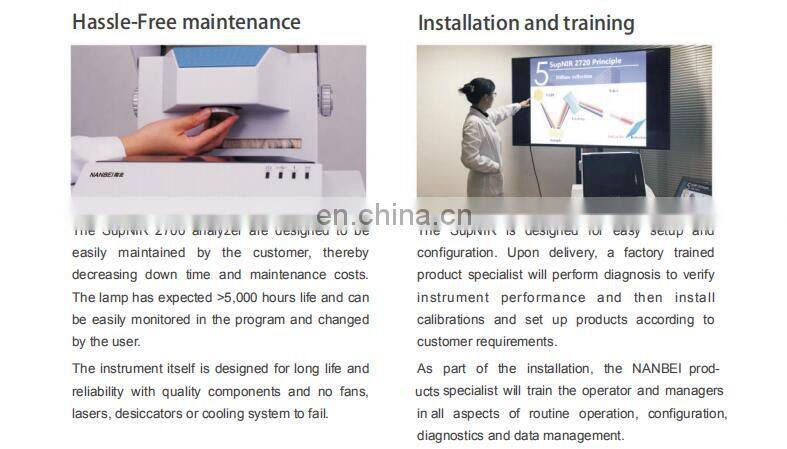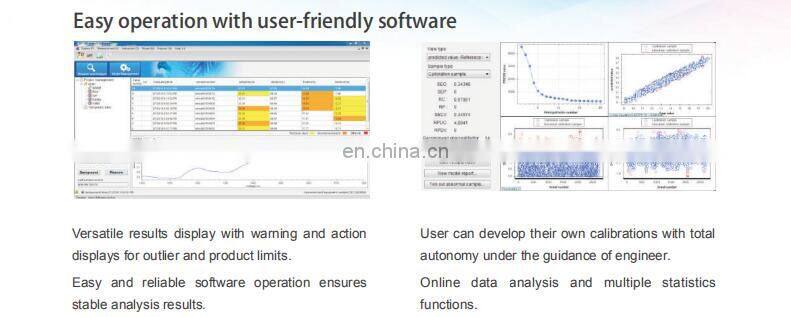 Fast : 10-second analysis of all type of samples; High performance : High accuracy,Repetability,Sability and Reliability Easy to Implement, Operate and Maintain modern Technologoy and a wide range of Acailable calibrations Free of Charge User-Friendly Software with Multiple Statistics Analysis.