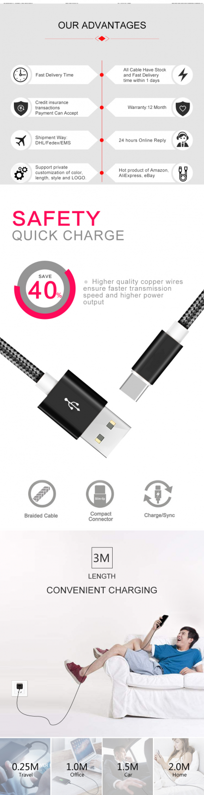 - High Speed Data Cable USB a to C Cable 1ft 3ft 6ft 10ft USB2.0 3A Fast Charging Cable