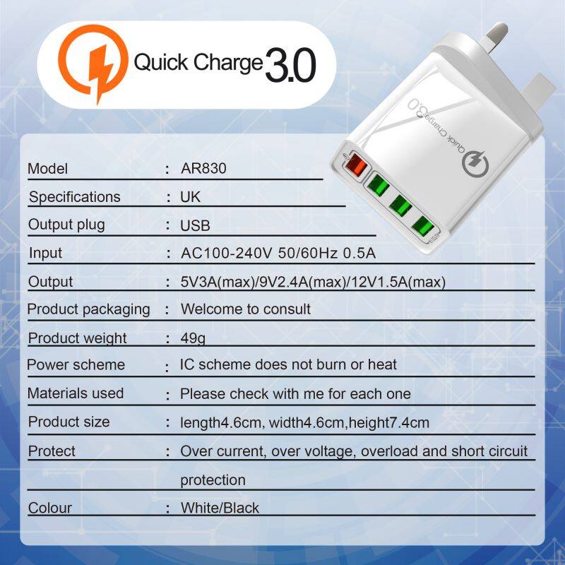 Home > Products > Mobile phone data cables/charger > Universal Wall Portable QC3.0 4 USB Travel Charger Adapter UK Plug Mobile Phone Charger for IPhone XS Max X 8 for IPad Tablet