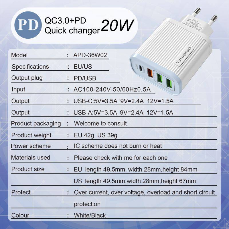 Home > Products > Mobile phone data cables/charger > 3 Usb Ports+pd 20w Eu US Home Travel Wall Chargers Adapter For Samsung s8 s9 S10 for Iphone 7 8 11 12 13