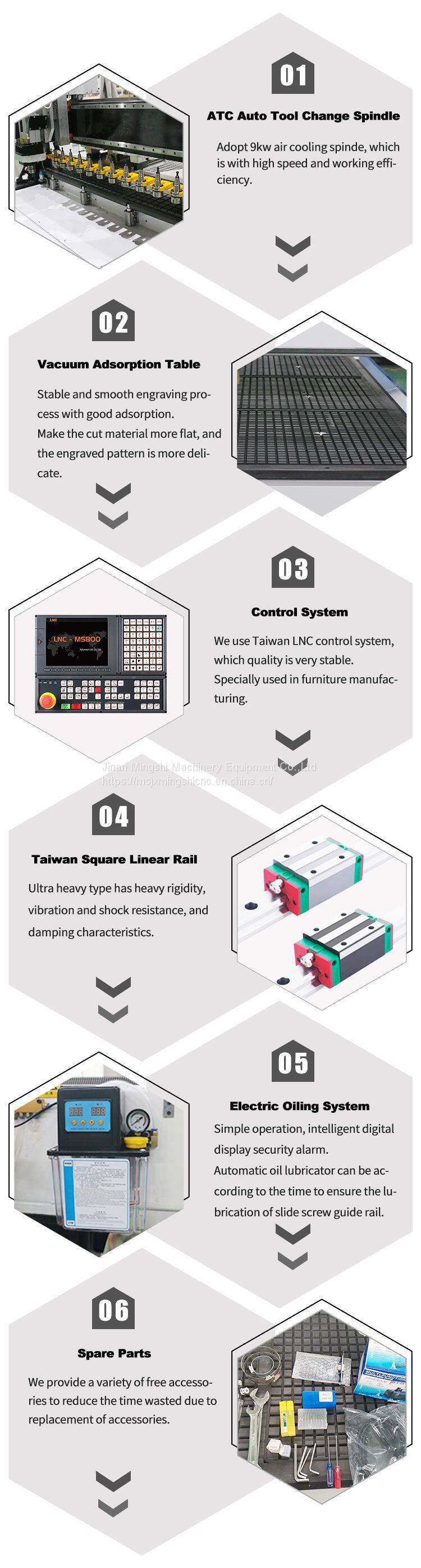 (2)Machine adopts Taiwan SYNTEC/LNC control system, high-performance industrial control system, which has the excellent and stable quality, good maintenance and can control to process the completion of the multi-level 3D sculpture, with fast and smooth three-dimensional processing, carving and cutting.