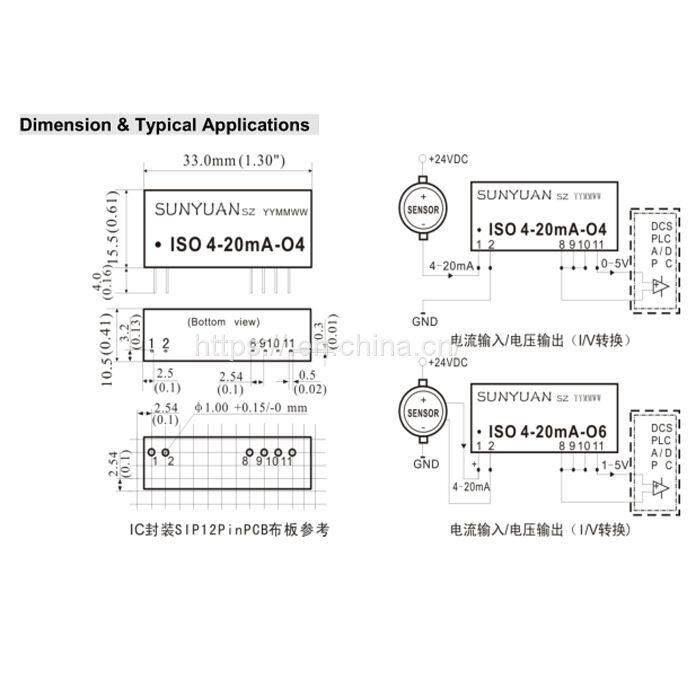 Sunyuan low cost small size I/V converter ISO 4-20MA-O is designed to solved the problems above in industrial site. That 4-20mA to voltage conversion IC not only realize the conversion between current and voltage signal, it also operates in low heat and passive mode to meet the application requirements in A/D interface data acquisition and signal conversion.It greatly reduce user's cost and the internal resource consumption in choosing microprocessor and provide simplest solutions to the developers.