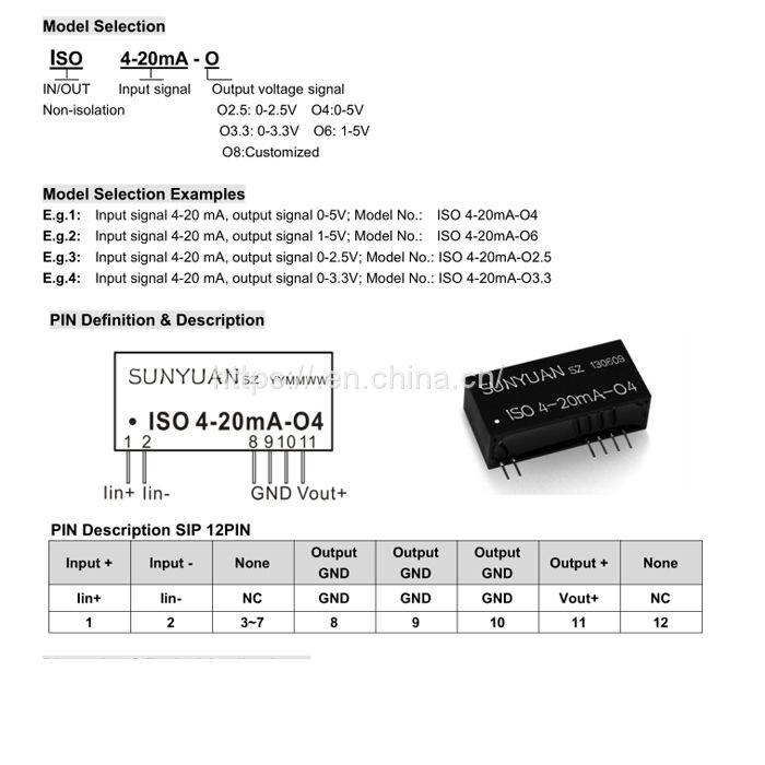 Sunyuan ISO 4-20mA-O is a kind of low cost small size 2-wire passive 4-20mA to voltage conversion IC, it can convert active 4-20mA signal input into voltage signal output. In designing the converter, 2-wire input loop powered technique is adopted, and the external power supply is not required which simplifies customers' design plan and reduce customers' cost. Inside the conversion IC, current signal conversion circuit, power inverting circuit, subtraction circuit and buffered output circuit are integrated. Very low input equivalent impedance enables the IC to collect current signals from sensor signal output loop circuit and when the input is 30mA signal the voltage drop is ≤9V. That 2-wire passive 4-20ma to voltage conversion IC achieves long-distance non-distorted transmission without external power supply.