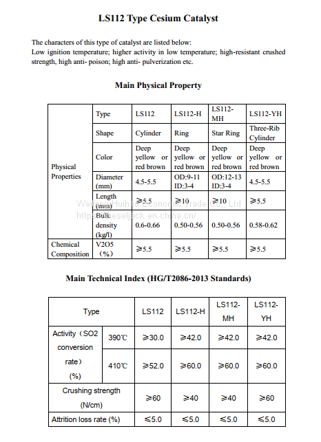 Vanadium pentoxide series of sulfuric acid catalysts can be used in the process of sulfuric acid production, to be more specific, is the process of SO2+I/2O2---SO3. With the help of Vanadium Catalyst, the rate of conversion can be improved greatly. It can guarantee the air speed of operation to add 10-20% more when using type star ring catalysts or ring catalysts.