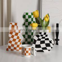 New Nordic Vase Deco Green Orange Black And White Checkerboard Grote Vaas Ceramic Vase For Aesthetic Home Decorations