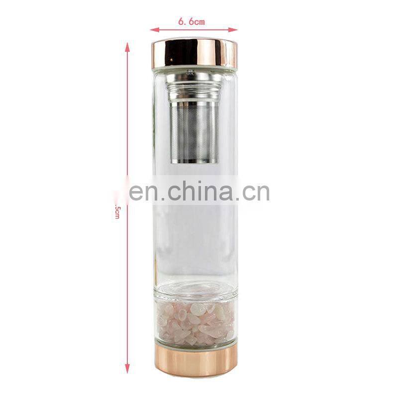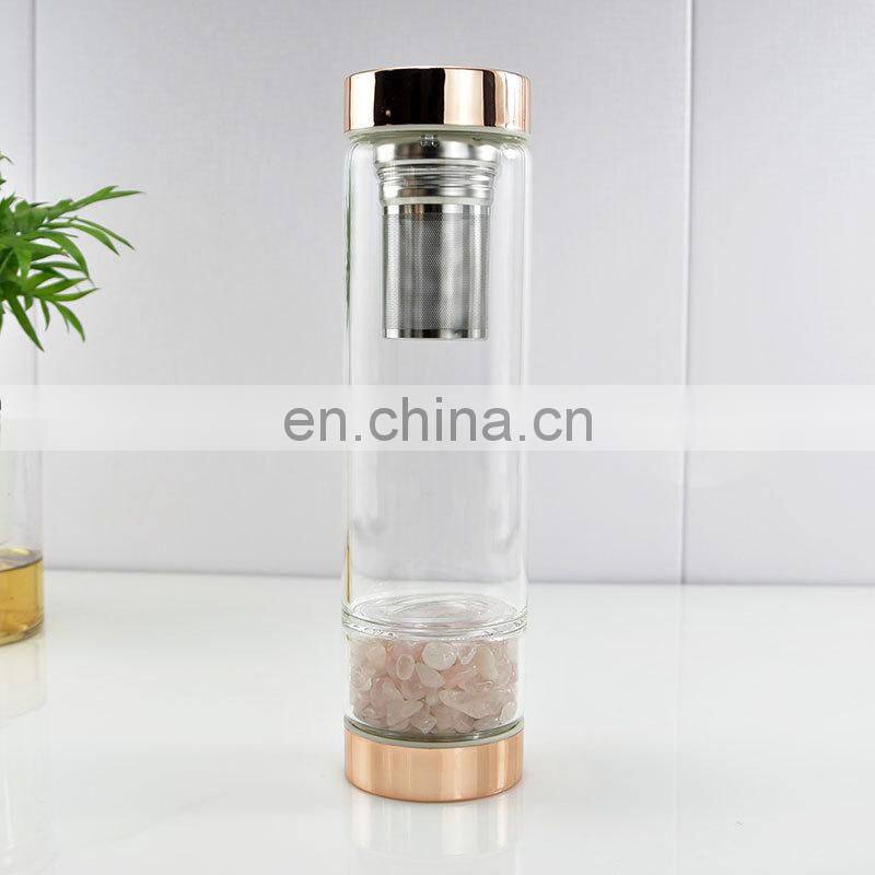 Home > Products > Mugs > Amazon Sales Filter Water Bottle Stainless Steel Rose Gold Plated Natural Rose Quartz Healing Crystal Infused Glass Water Bottle