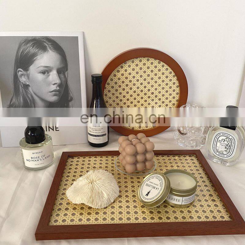 Wholesale INS Korean Decoration Nordic Japanese Wood Grain Desktop Rattan Round Serving Tray Round Rattan Tray for Home Decor