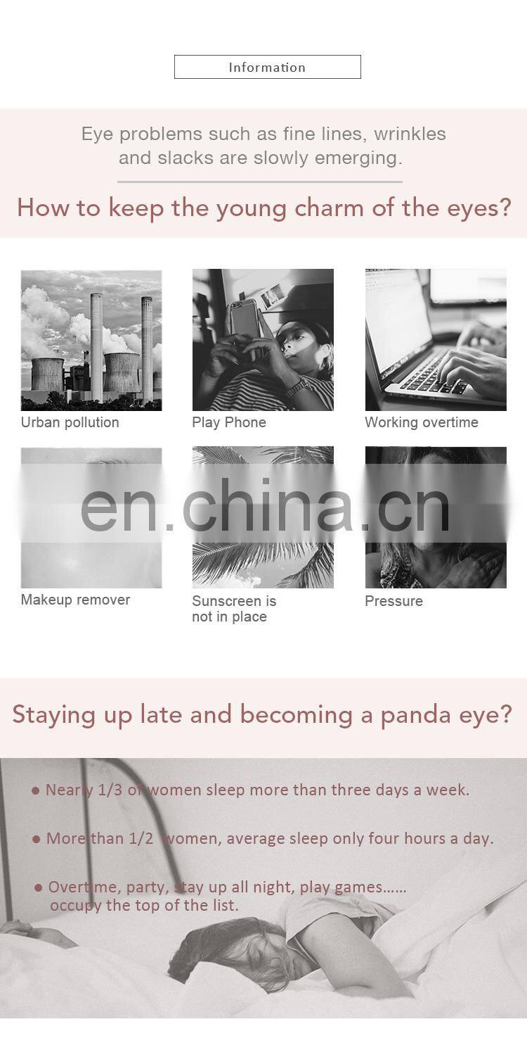 Function | Remove Wrinkles Creases Reduce Dark Circles Repair&Tighten Eye-contour Skin 1. Anti aging, wrinkle care that keeps skin nourished, moisturized, and elastic around the eyes; 2. Replenishes moisture, fine-lines treatment; 3. Reduces the appearance of dark circles and puffiness, enhances brightness around the eyes, evens skin tone appearance as well as smoothes and evens skin texture. |