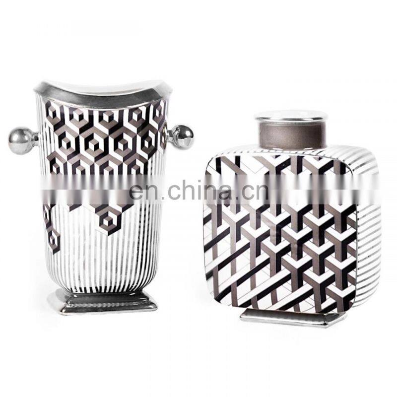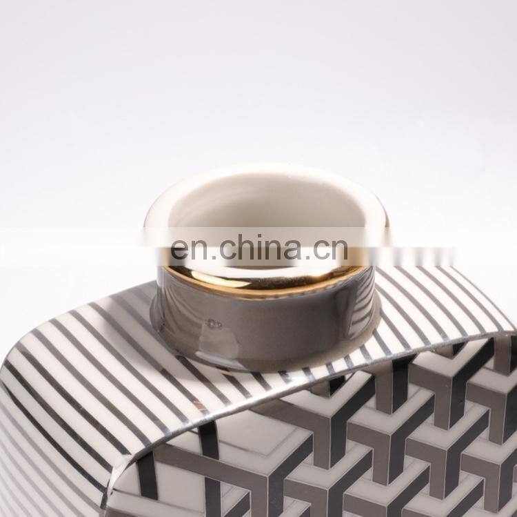 Vintage Luxury Retro Geometric Pattern Golden Silver Edge Decorative Ceramic Vase for Home Decor