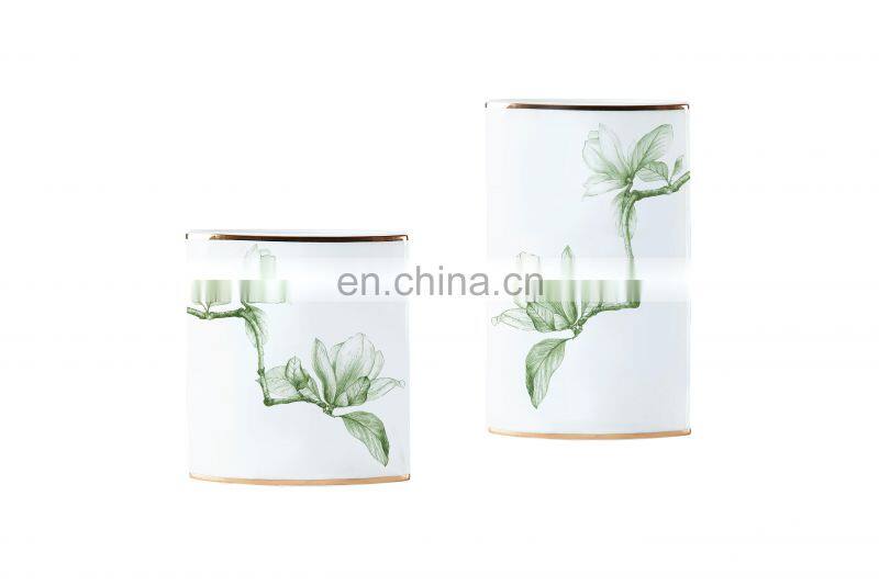 Modern New Chinese Green Ink Design Handmade White Ceramic Flower Vases for Porcelain Home Decor