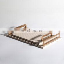 Hot-sell Modern Hotel Feather Pattern Decoration Rectangular Luxury Leather Tray With Gold Handle