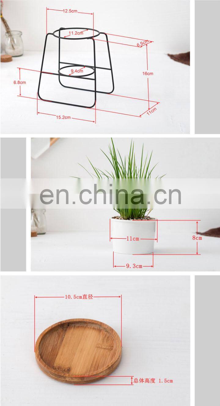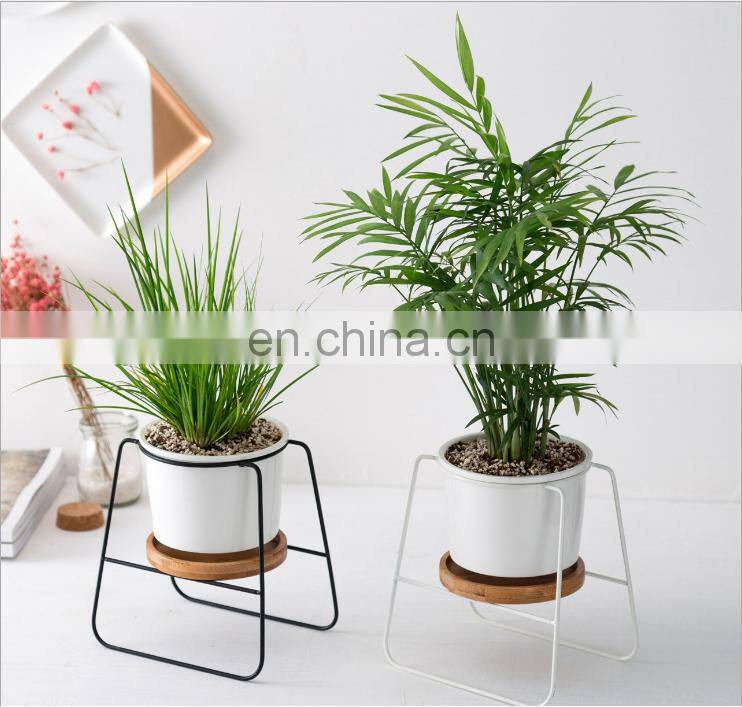 Modern Decorative Flower White Ceramic Pot Metal With Bamboo Tray Cute Frame For Home Decor
