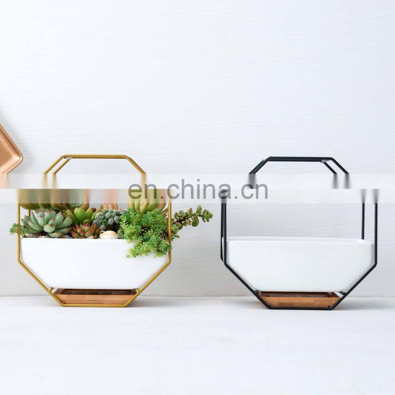 Modern Decorative Flower White Ceramic Pot Metal With Bamboo Tray Cute Frame For Home Decor