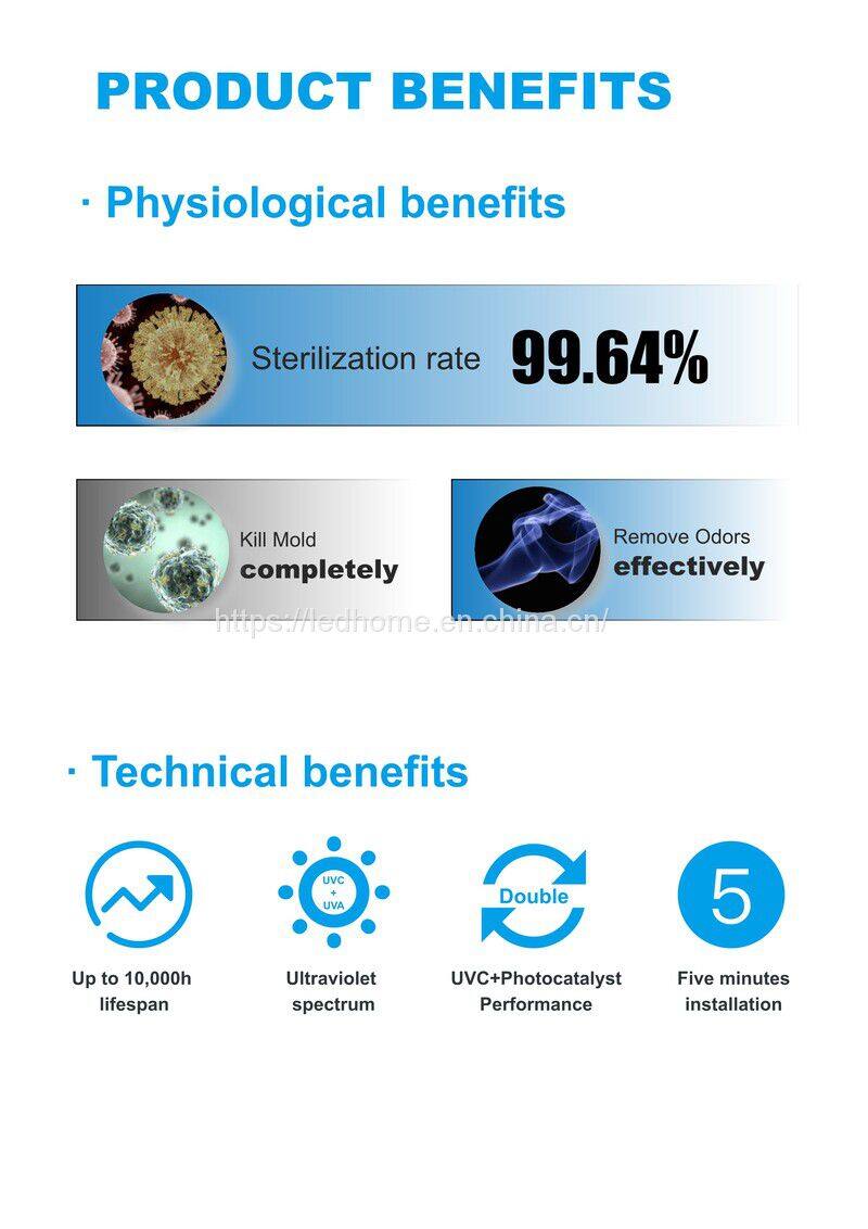 2. Eco-friendly, advanced UVC+UVA+Photocatalyst triple disinfection technology.