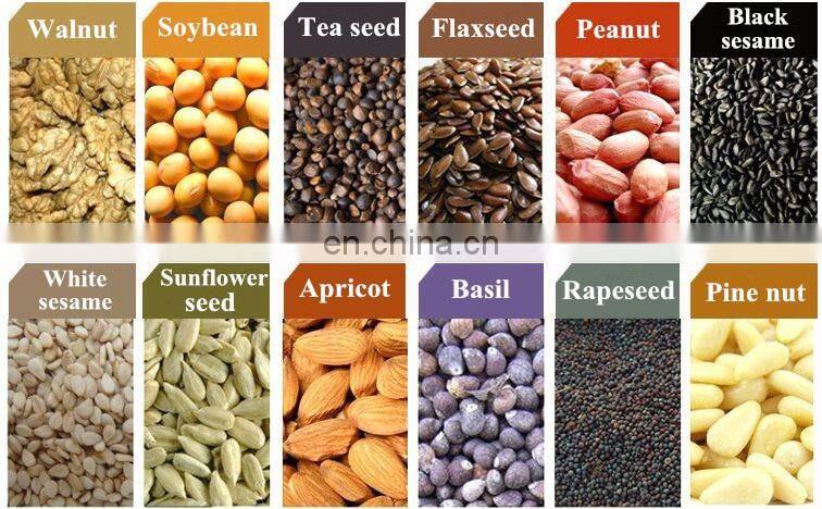 1). This mini oil expeller machine can process sesame seed, rapeseed, peanut, soybean, cottonseed, almond, Tung-oil seed, sunflower seed, tea seed, walnut, caster seed, Perillaseed , Hazelnut,oil palm, oil olive, avocado, pomegranate seed , pistachio nut, neem seed, coconut, about 150 types of oil crops;