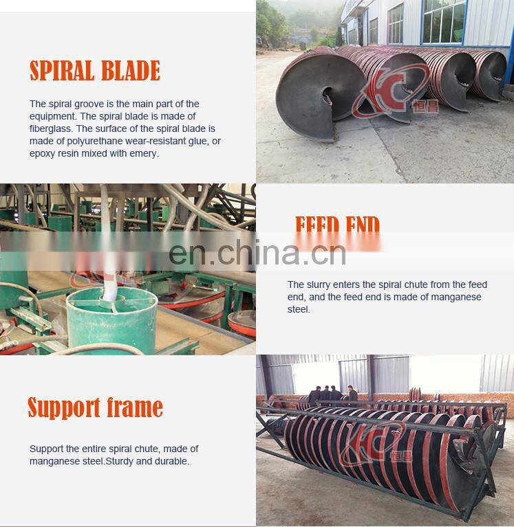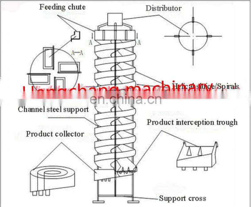 Spiral chute uses gravity to separate particles of different densities. It is used globally in the mineral processing industry, consists of an open trough that twists downward in helix configuration about a central axis.
