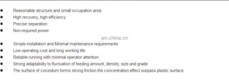 It is used to separate the iron, tin, wolfrmite, tantalum, niobium, gold ore of the size between 0.3 and 0.02mm, and the other metals and nonmetal minerals with different gravity property .