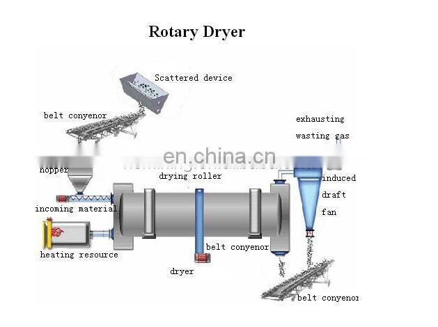 The wet materials are conveyed to the hopper through the belt conveyor or bucket elevator, and then enter into the feed end through the hopper charger and the feeding pipe in sequence. The inclination of the feeding pipe must be greater than the natural inclination of materials in order to make the materials flow into the dryer smoothly. The dryer cylinder with slight inclination with the horizontal line. The materials enter from the higher end, and the heat carrier enters from the lower ender; the two contact each other from opposite directions, but there are also circumstances that the heat carrier flows into the dryer body together with the material.