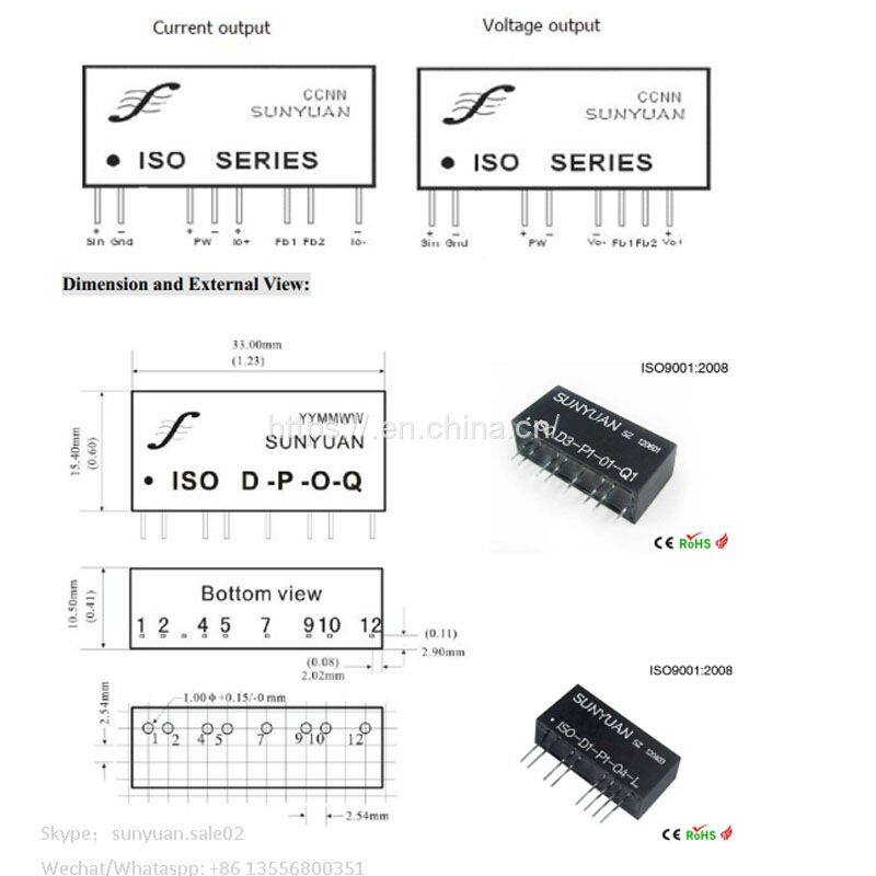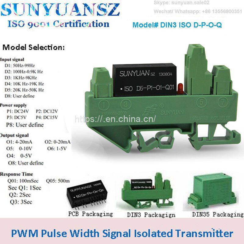 ISO D-P-O series PWM pulse to 0-5V/0-10V/4-20mA Transmitter is a duty cycle of the PWM pulse width modulated square wave signal through the isolation convert hybrid integrated circuits for analogue standard signals. The product is integrated on the same chip with high isolation DC / DC power supply circuit, the PWM drive circuit, high-speed converter and signal amplification and conversion circuits, etc., especially suitable for industrial process instrumentation, signal isolation transmitter. Currently widely used in the industrial field in the remote control. ISO D-P-O internal integration of high efficiency DC-DC isolated power supply to the IC internal input conditioning circuit and output conditioning circuits, the conversion circuitry. SMD process structures and new isolation technologies allow the device to achieve: Power, signal input / output 3000VDC isolation. And meet the industrial wide temperature, humidity, vibration adverse work environment requirements.