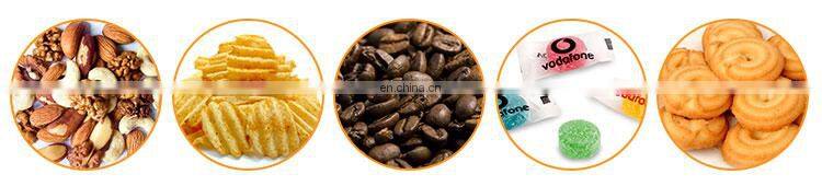 All kinds of grain material, bulk material with high precision and fragility which such as candy, melon seeds, chips, peanut, nut, preserved fruit, jelly, biscuit, currant, almond, chocolate, filbert, corn, potato crisps, pet foodstuff, puffed food, hardware and plastic can be weighed by the ration.