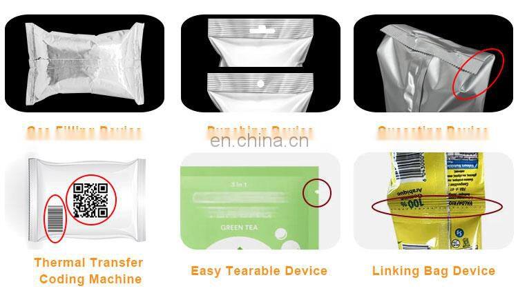 Depending on your needs, you can choose to add the following configuration. Such as thermal transfer coding machine, linking bag device, gas-filled device, easy tearing device, gusseting device and hole device.