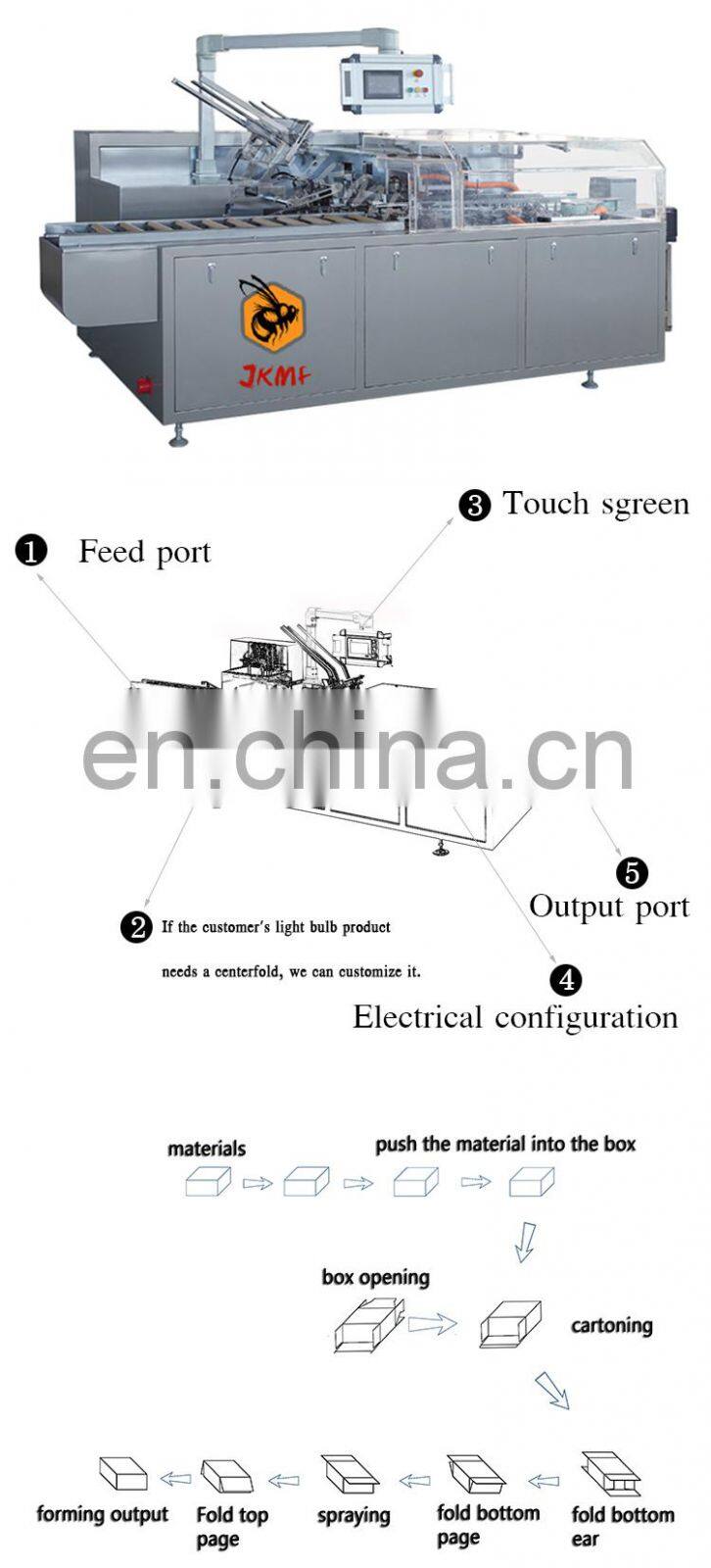 JKMF automatic cartoning machine can achieve full automatic products conveying & feeding, flat carton feeding, carton opening, products pushing, carton folding, carton closing, finished carton package discharging.