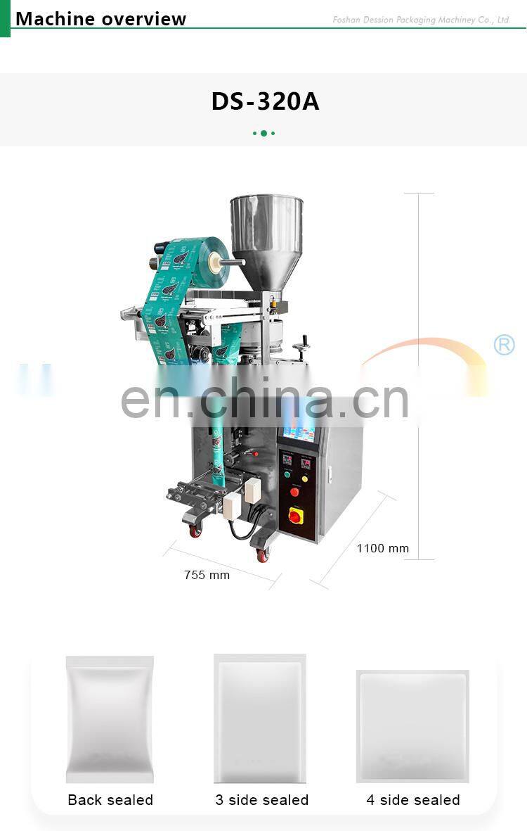Dession granule packing machine is suitable for loose rounded granules in the food, chemical and other industrial. Such as: puffed granules, peanuts, popcorn,melon seeds, rice, pepper, sugar,salt, biscuits etc.