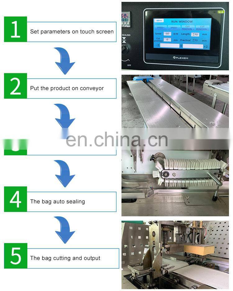 Just set the parameters on the screen, and then you can start the machine. Put the product on the conveyor belt, the machine will automatically pull the film, the bag is formed, sealed, and finally the bag is cut.