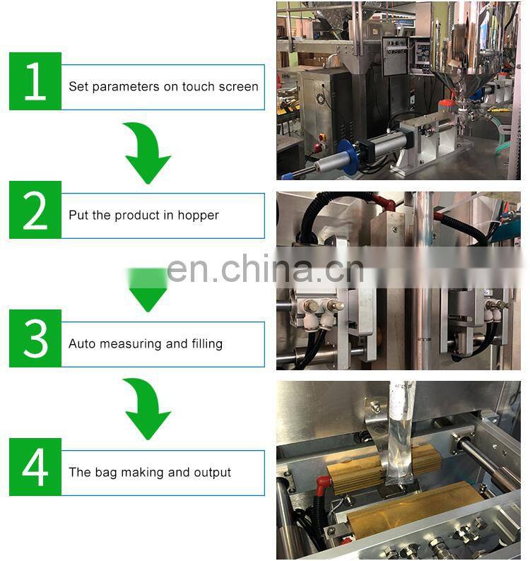 Just set the parameters on the screen, and then you can start the machine. Put the product in the hopper, the machine will automatically pull the film, the bag is formed, sealed, and finally the bag is cut.