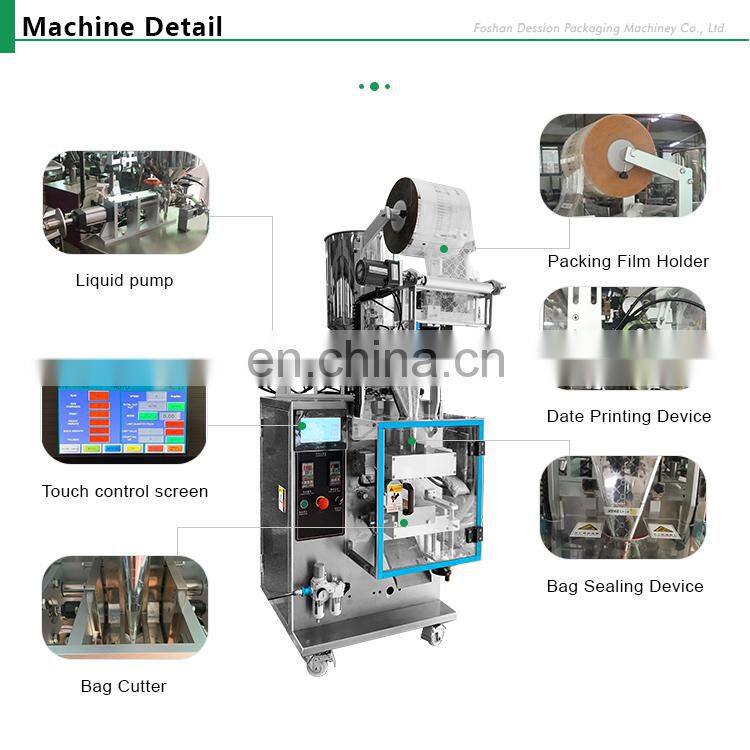 Dession liquid packing machine is suitable for the packaging of various liquid and sauces, such as soup,edible oil,liquid medicine,cream,seasoning sauce,honey,shampoo and shower gel etc.