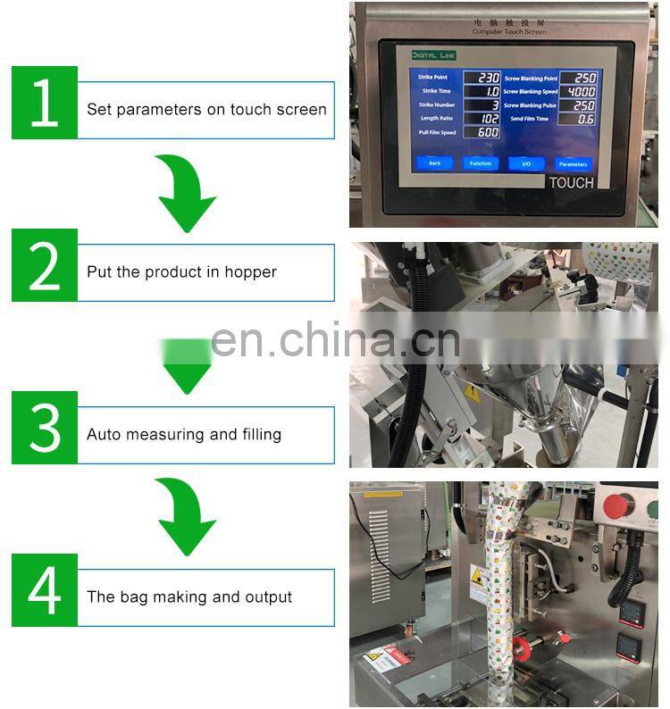 Just set the parameters on the screen, and then you can start the machine. Put the product in the hopper, the machine will automatically pull the film, the bag is formed, sealed, and finally the bag is cut.
