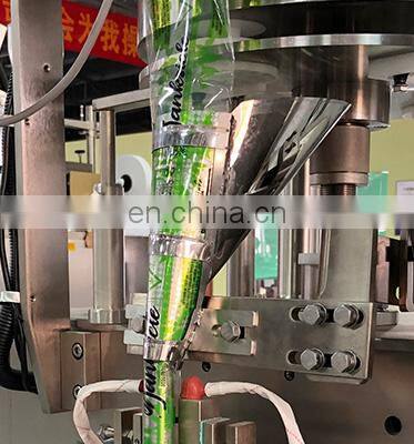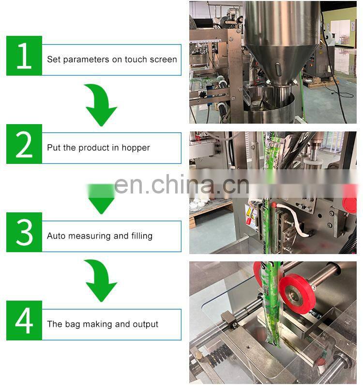 Just set the parameters on the screen, and then you can start the machine. Put the product in the hopper, the machine will automatically pull the film, the bag is formed, sealed, and finally the bag is cut.