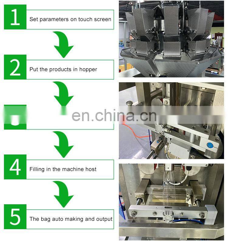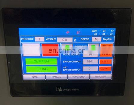 Just set the parameters on the screen, and then you can start the machine. Put the product in the hopper, the machine will automatically pull the film, the bag is formed, sealed, and finally the bag is cut.