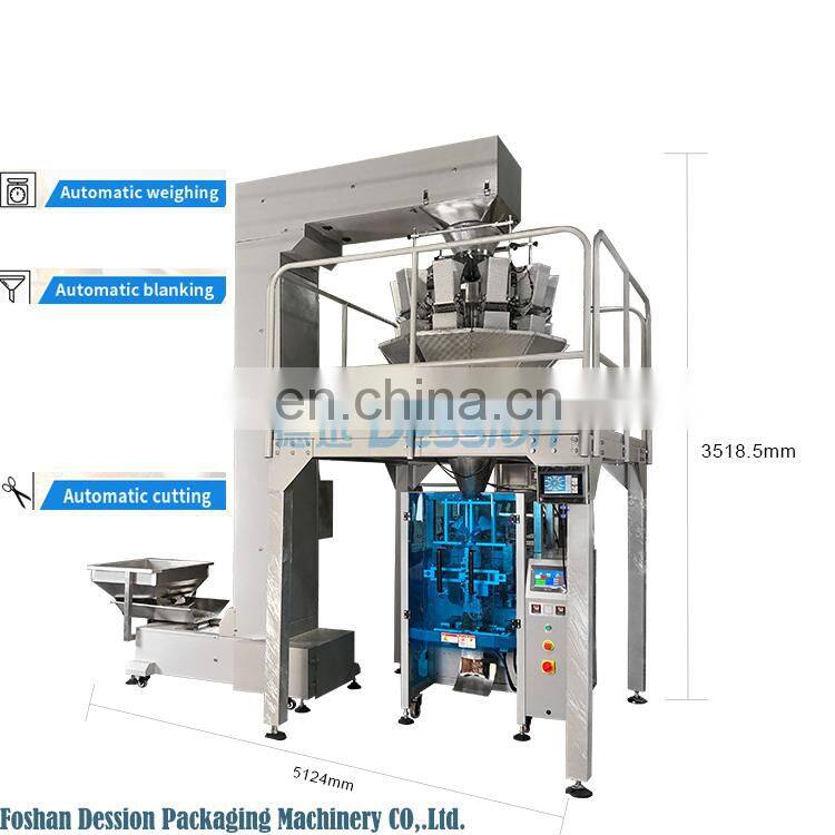 Dession automatic weighing packing machine is suitable for packaging of bulk materials with high precision and fragility, such as:puffed food, jelly, candy, nuts, potato chips, small hardware, medicinal materials, etc.