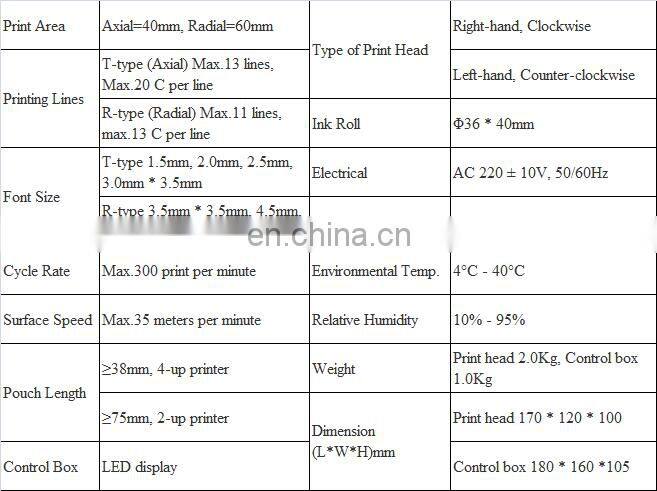 It can be equipped with all kinds of flow packing machine and continuously vertical packing machine for tracing and printing production date, lot number, expire date, etc. automatically. Compact in structure, convenient in assembling and using, fast in printing with large printing cover, flexible in formatting types, and much shorter in the minimum printing distance, it has widely used in food and drug industries.