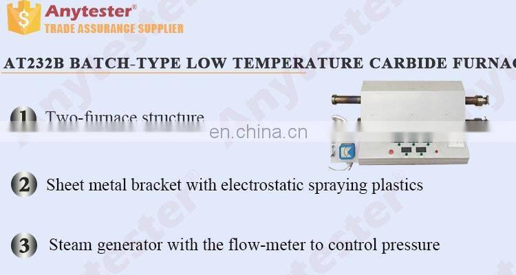 AT232B Batch-type Low Temperature Carbide Furnace consists of pre-heating tube, working furnace tube, steam generator and flow controlling system. The pre-heating tube has two heating sections and the working furnace tube has three heating sections. Pre-heat steam produced by steam generator, air or oxygen to 600℃ in the pre-heating tube and then enters into the working heating furnace tube through pressure-adjusting valve and flowmeter. The pre-heat tube is connected with the working furnace tube by a rapid-connection connector and they are horizontally laid in rank. The heating furnace for the working furnace tube is open-able and dischargeable, convenient to observe. There is stainless steel filtering screen in the pre-heating tube for uniformly heating gas.