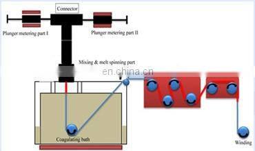 AT226 Series Plunger-type Melt Spinning Machine is used to carry out the melt spinning of polypropylene, polyester, polyamide and other special materials with plunger metering system. The raw material melts and flows into the plunger-type cylinder. The plunger-type cylinder driven by the servo motor can precisely monitor and control the flow of melt liquid. The melt liquid passes through the filtering plate, distributing plate and then is extruded through the spinneret plate to spin. The spun fiber can be direct wound onto the winding roll or passes through coagulating bath (optional), heat stretching (optional), relax hot setting (optional) and then be wound onto the winding roll.