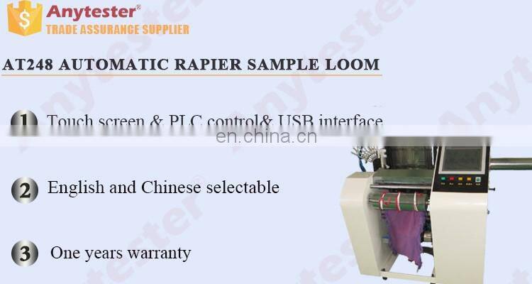 AT248 Automatic Rapier Sample Loom is used for sample weaving of all kinds of fabrics, such as cotton, hair, jute, silk, chemical fiber, blending, etc. It consists of pneumatic shedding, rapier weft insertion, mechanical let-off, mechanical beating-up, mechanical take-up and pneumatic selection of weft yarns. It is widely used in weaving mills, scientific research units, textile institutes and foreign trade companies, etc.