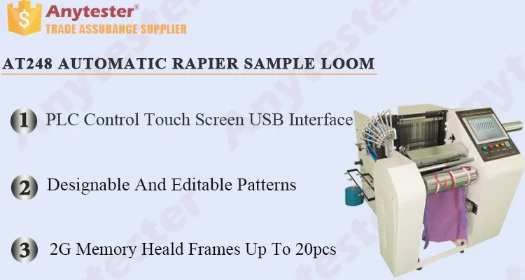 AT248 Automatic Rapier Sample Loom is used for sample weaving of all kinds of fabrics, such as cotton, hair, jute, silk, chemical fiber, blending, etc. It consists of pneumatic shedding, rapier weft insertion, mechanical let-off, mechanical beating-up, mechanical take-up and pneumatic selection of weft yarns. It is widely used in weaving mills, scientific research units, textile institutes and foreign trade companies, etc.