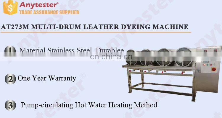 AT273M Series Multi-drum Leather Dyeing Machine is mainly used to dye leather or fur from pig, cattle, and sheep. It is suitable for liming, tanning, retanning, dyeing and fatliquoring during leather processing. As an essential experiment equipment for modern leather production, it is mainly used for small batch and multi-pieces test of various kinds of leather to obtain the best production processes.