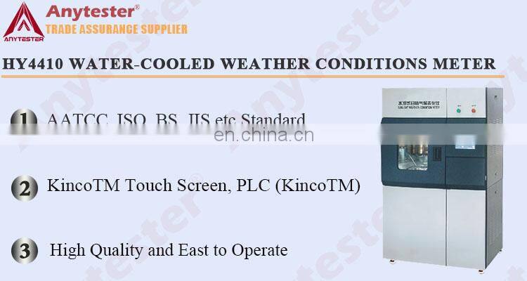 HY4410 Water-cooled Weather Conditions Meter is suit to determine the color fastness and aging to sunlight, weather resistance, compound color fastness to sunlight-sweat of colored textile, leather, leatherette, plastic, etc, by setting various parameters of irradiance, temperature, humidity, spray to simulate natural condition in lab. Be able to control irradiance real-time, automatically inspect and compensate irradiance, temperature, humidity.