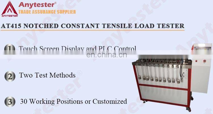 AT415 Notched Constant Tensile Load Tester is used to evaluate the stress crack resistance of polyolefin geomembranes by notched constant tensile load (NCTL) test. It is mainly applicable to the geomembranes used on the landfill site. Dumbbell-shaped notched test specimens from a polyolefin sheet is subject to a constant tensile load in the presence of a surface-active agent and at an elevated temperature. The time to failure of the test specimen is recorded. The results of a series of such tests conducts at different stress levels are presented by plotting stress level against time for each stress level on a log-log axis.