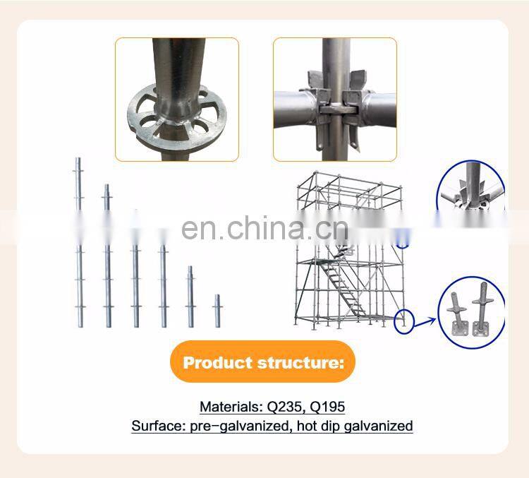2.There are some rosette plates each 500mm on the upright tube, you can lock the Ring-lock Galvanized Scaffolding by inserting the
