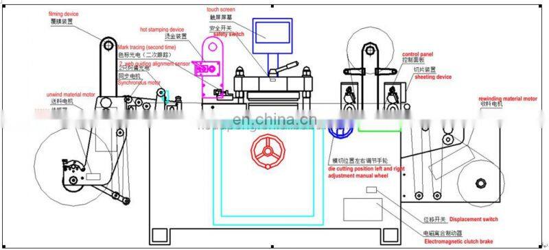 1 , unwinding part A. Aluminum guiding roller B. unwinding air-shaft C. unwind pulling material roller + steel roller D. unwind pulling material motor300W E. unwind damping device F. Electric Eye ( paperless automatic stop) 2, laminating part ( optional function ) 1. filming device ( unwinding function ) A. Filming unwinding roller 2. filming device ( unwind rewind function ) A. filming unwinding roller B. filming rewinding roller C. filming rewinding motor D. Aluminum guiding roller 3. Rectification system A.Aluminum guiding roller B. rectification motor 70W C. Rectification electric eye 4. printed mark tracing part A. Paper platform B. Electric eye holder C. Color tracking electric eye 5. punching hole part ( optional part ) 1.Mechanical type punching hole A. punching hole mold B. Connection block (connect with up die cutting plate) 2. Pneumatic punching hole A. punching hole mold B. Pneumatic cylinder 6. die cutting part A.Die cutting seat assembly (can move left and right – paper unwind direction) B. Main motor 2.2KW C.automatic supply oiling system ( copper tube connect wire, semi sealing type , Lubricating oil recycling ) D.Buffer spring E. Down cutting plate seat height adjustment ( 2 Inclined plate) F. Up cutting plate seat Obliquely turn up system ( more easy to change the cutting dies) 7. Pulling material part A.pulling material roller+ steel roller B.pulling material servo motor 2.2kw(Zhejiang Dongling) C.Timing belt 8. Waste scrap part A. guiding roller B. waste scrap rewind roller C. Buffer Disposal Device - Optional function (For some thick adhesive material difficult to scrap material ) 9. sheeting blade part A.Aluminum guiding roller B. Cutter clutch assembly C. up cutting blade (inserting steel) D. down cutting blade (inserting steel) 10. Rewinding part A. Aluminum guiding roller B. rewinding cushioning device C. Rewinding pulling material rubber roller+ steel roller D. rewinding motor 800W ( when sheeting can stop) 11. Hot foil stamping part ( optional part ) 1. Stepper motor stamping device A. Hot stamping unwind roller B. Aluminum guiding roller C. hot stamping pulling material roller D. hot stamping pulling material motor ( stepper motor ) 2. Servo motor hot stamping device A. Hot stamping unwind roller B. Aluminum guiding roller C. hot stamping pulling material roller D. hot stamping pulling material motor ( servo motor 0.75KW Zhejiang Dongling) 12. electric control part A.PLC (Panasonic) B.Touch screen ( Weinview TK6070IQ) C. Servo motor driver (Zhejiang Dongling) D. Frequency speed converter ( HUALAN) E. Power switch 220-2-110( Taiwan ) 13. metal sheet , safety cover etc 14. others A. Tools B. Operation manual |