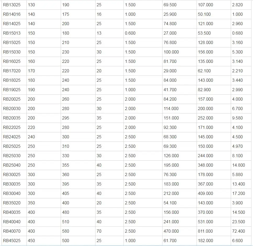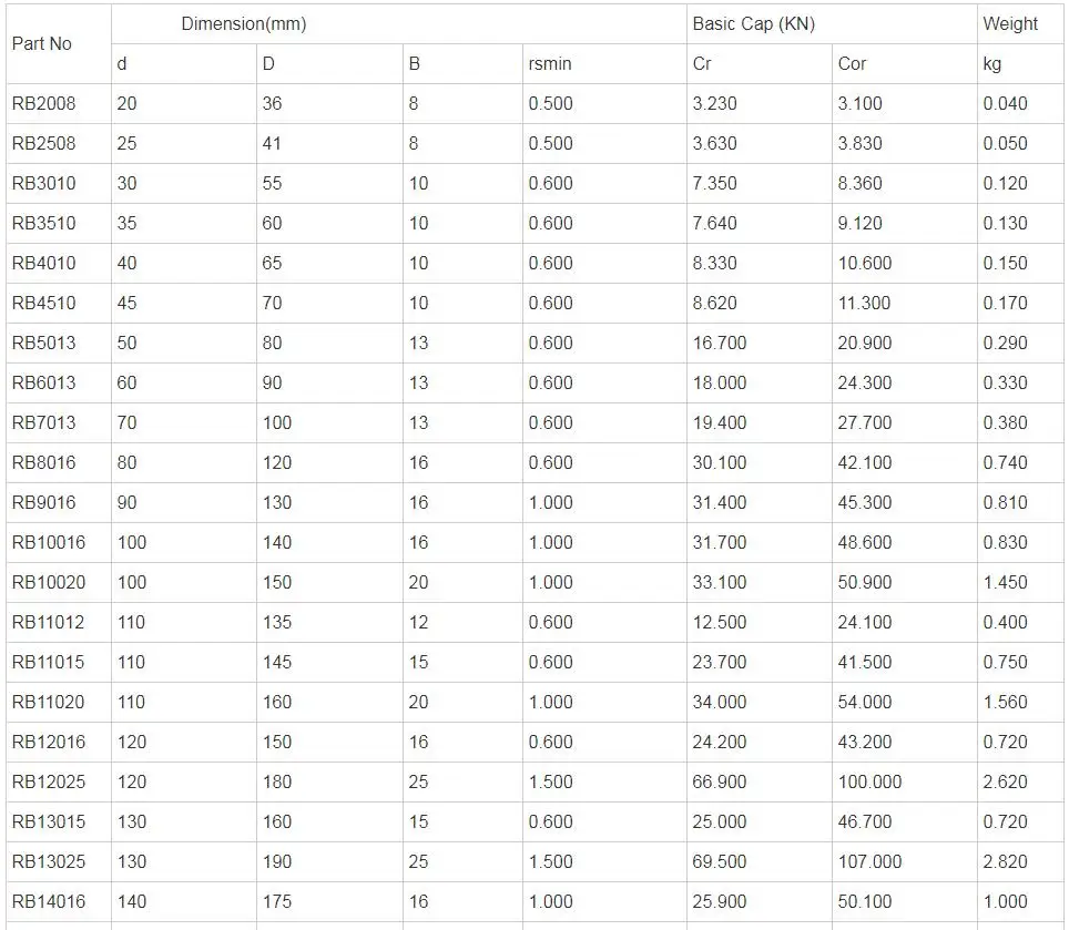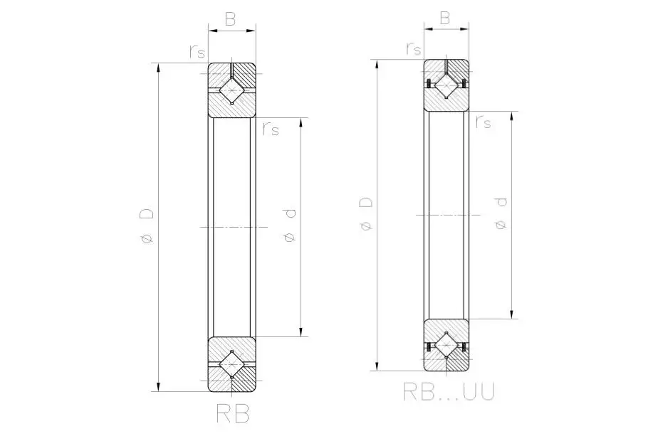 RB series cross cylindrical roller bearings are the basic type of cross cylindrical roller bearings. The size of the inner and outer rings is miniaturized. It has structure with separable outer ring, integrated design of inner ring, suitable for parts requiring high rotation accuracy of inner ring. RB series cross cylindrical roller bearing has two structural types: RB (open type) and RB-UU (double end face seal) type.