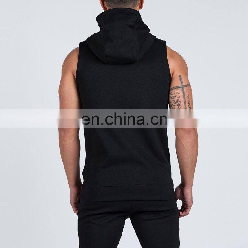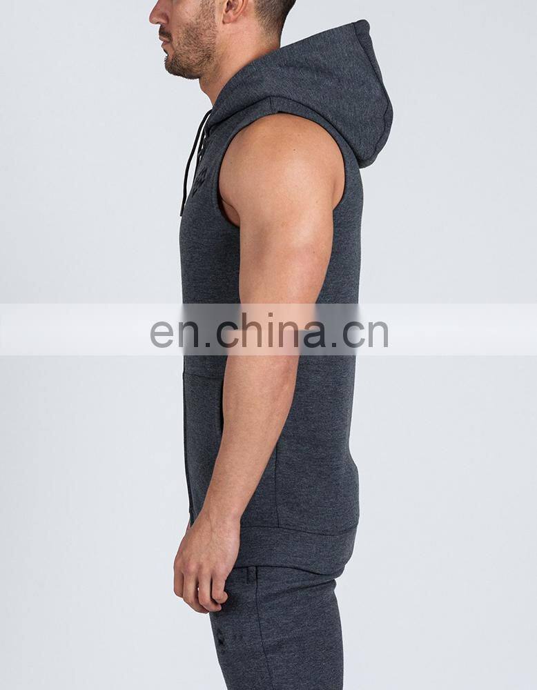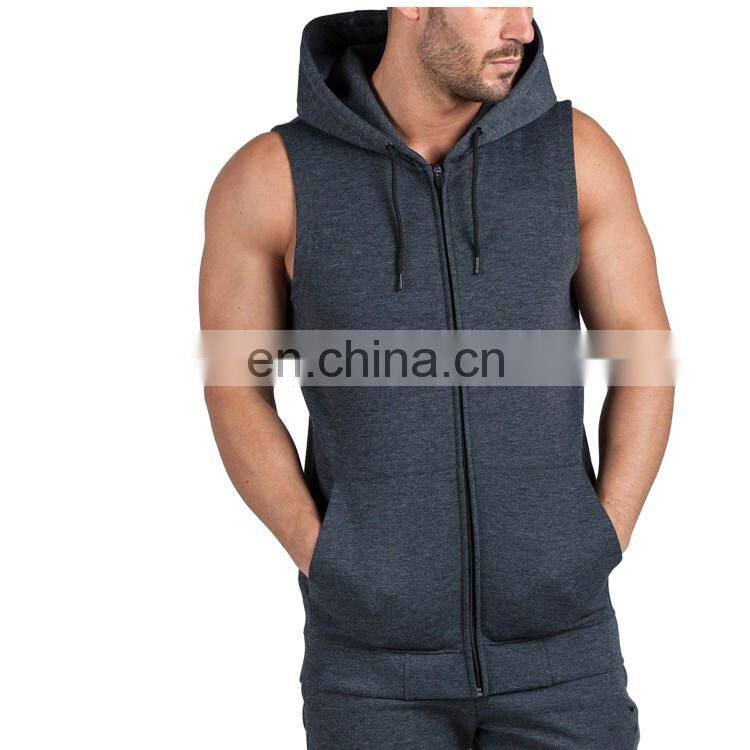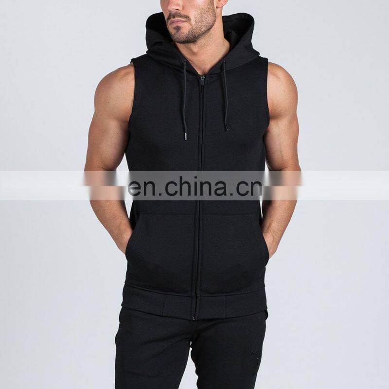Manufacturer Wholesale Custom Embroidery Logo Cotton Men Full Zip up Blank Gym Fitness Sleeveless Hoodie With Pockets