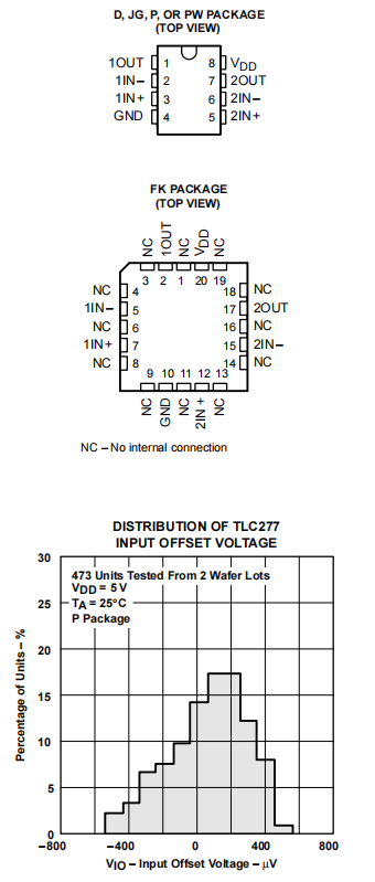The extremely high input impedance, low bias currents, and high slew rates make these cost-effective devices ideal for applications previously reserved for BiFET and NFET products. Four offset voltage grades are available (C-suffix and I-suffix types), ranging from the low-cost TLC272 (10 mV) to the high-precision TLC277 (500 uV). These advantages, in combination with good common-mode rejection and supply voltage rejection, make these devices a good choice for new state-of-the-art designs as well as for upgrading existing designs.